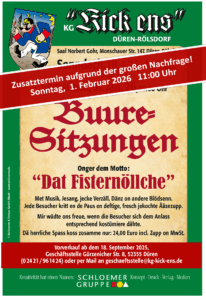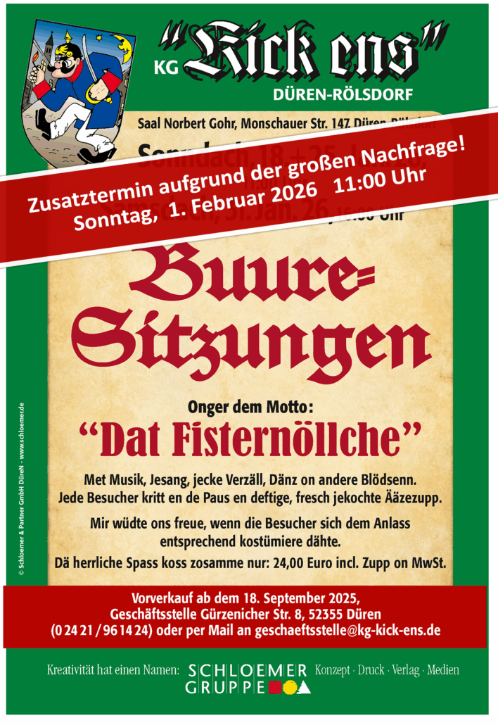 Wer also miterleben möchte, wie „Walterscheidts Dröck“ und das Ensemble der Rölsdorfer Buuresitzung 4 Stunden beste Unterhaltung garantieren, ist herzlich eingeladen, am 01. Februar 2026 dabei zu sein. Ob als treuer Fan des Sitzungsformates, oder als neugieriger Erstbesucher!